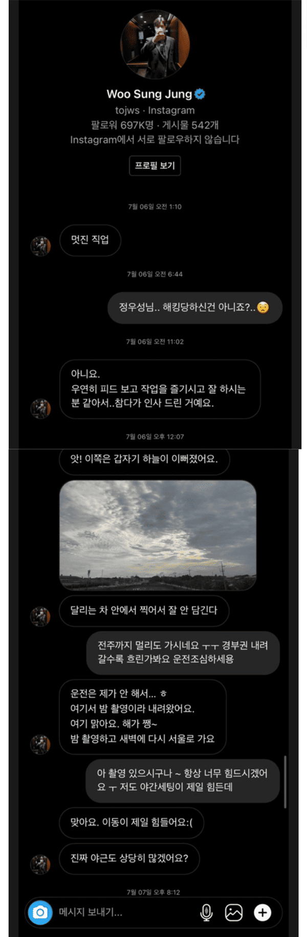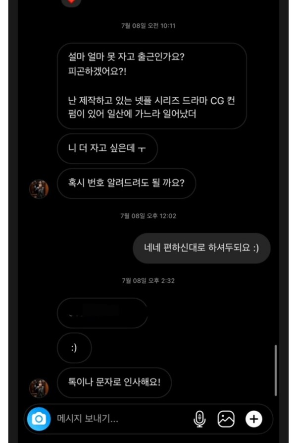 이에 상대방은 "촬영 있으시구나 항상 너무 힘드시겠어요. 저도 야간 세팅이 제일 힘든데"라고 답했고, 정우성은 "맞아요. 이동이 제일 힘들어요. 진짜 야근도 상당히 많겠어요"라며 연락을 계속 이어갔다.
