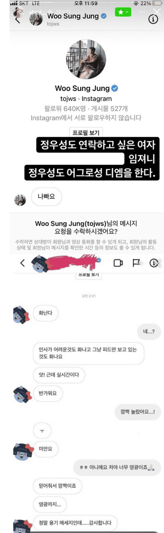 여기서 끝이 아니다. 또 다른 여성과 인스타그램 DM에서 그는 다짜고짜 "화난다"라고 말했어 이에 상대방은 "네?"라고 놀라했다. 정우성은 "인사가 어려운 것도 화나고 그냥 피드만 보고 있는 것도 화나요"라며 "앗 근데 실시간이네요 반가워요"라고 말했다. 정우성의 갑작스런 DM에 깜짝 놀랐다고 답한 여성은 곧 "영광이다"라고 말하자 "믿어줘서 깜짝이요 영광까지.. 정말 용기낸 메세지인데 감사합니다"라고 답했다.