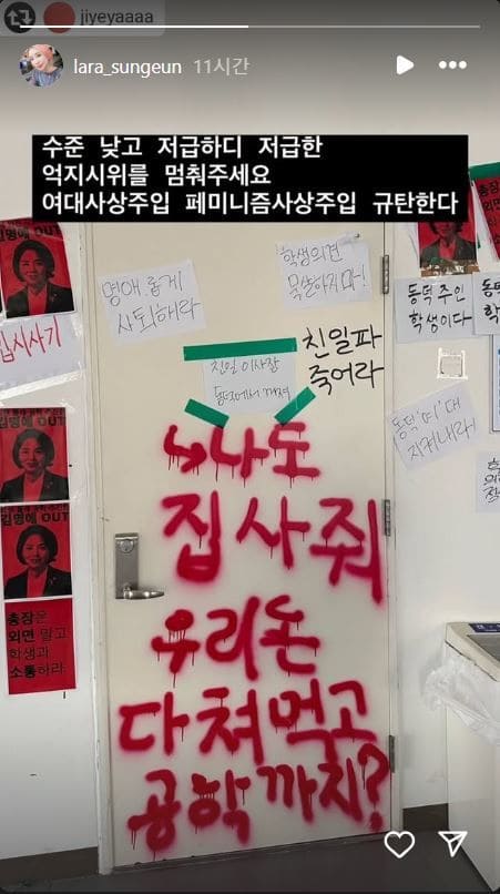 김성은이 시위 비판 메시지와 함께 올린 사진에는 문 위에 '나도 집 사줘. 우리 돈 다 처먹고 공학까지?'라는 문구가 빨간 래커로 쓰여있는 모습이 담겨있다.